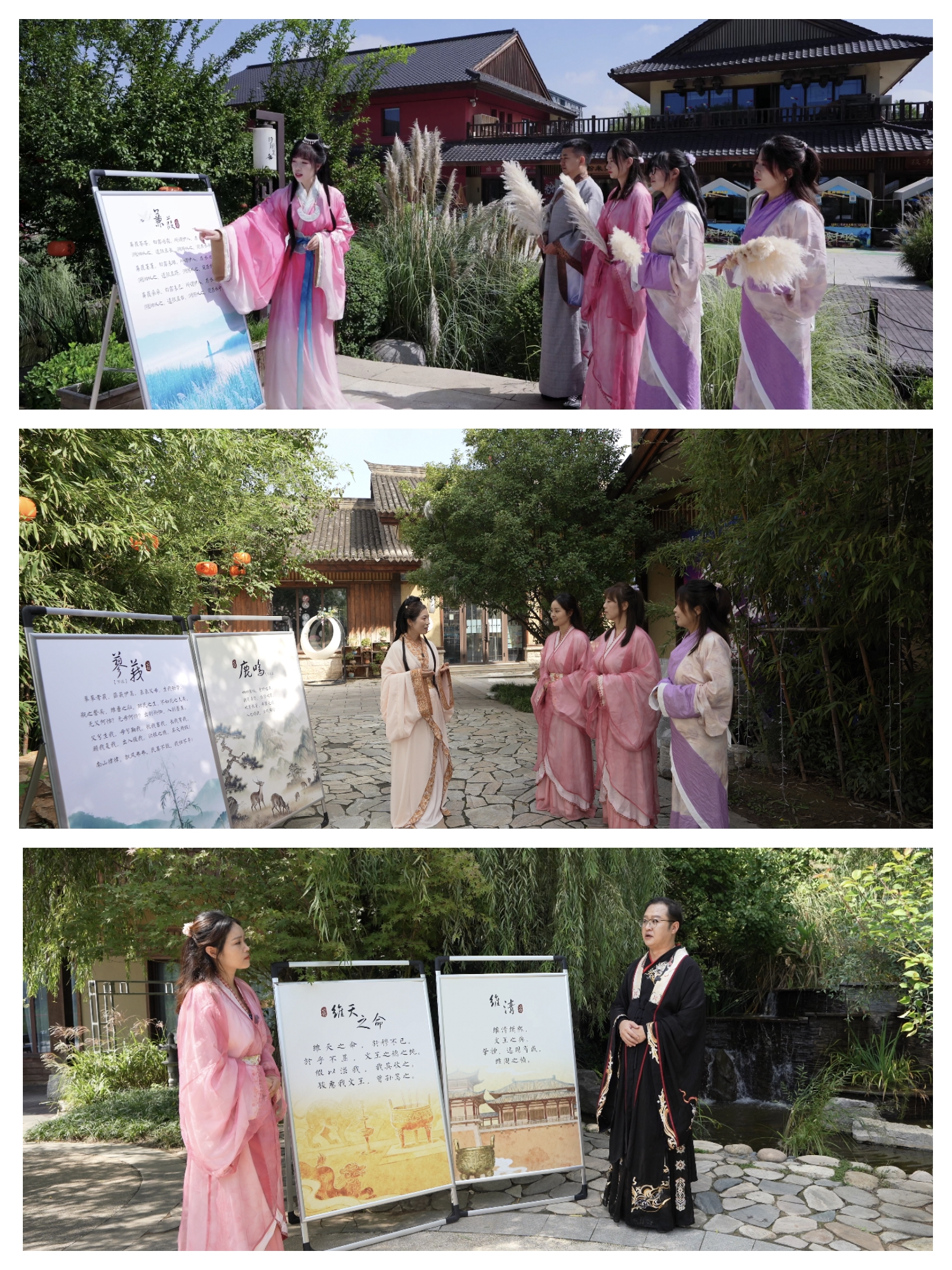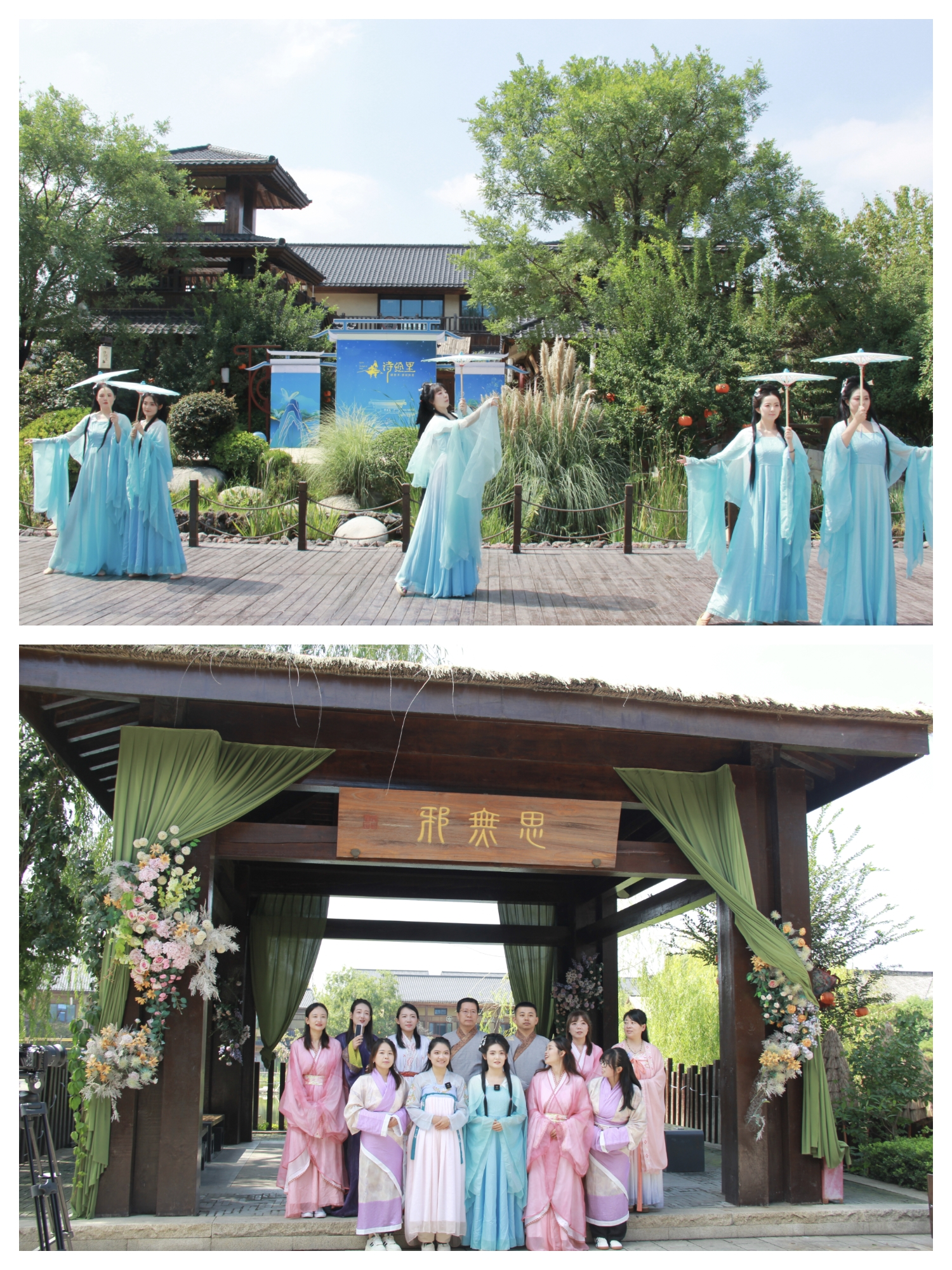 近日,教学团队在诗经里主题文化小镇成功开展沉浸式实景教学活动,将整个教学改革进程推向了新的高潮。在诗经里的古风雅韵之中,教学活动以一支飘逸的《秦风·蒹葭》伞舞开场,瞬间将参与者带入诗意的时空。